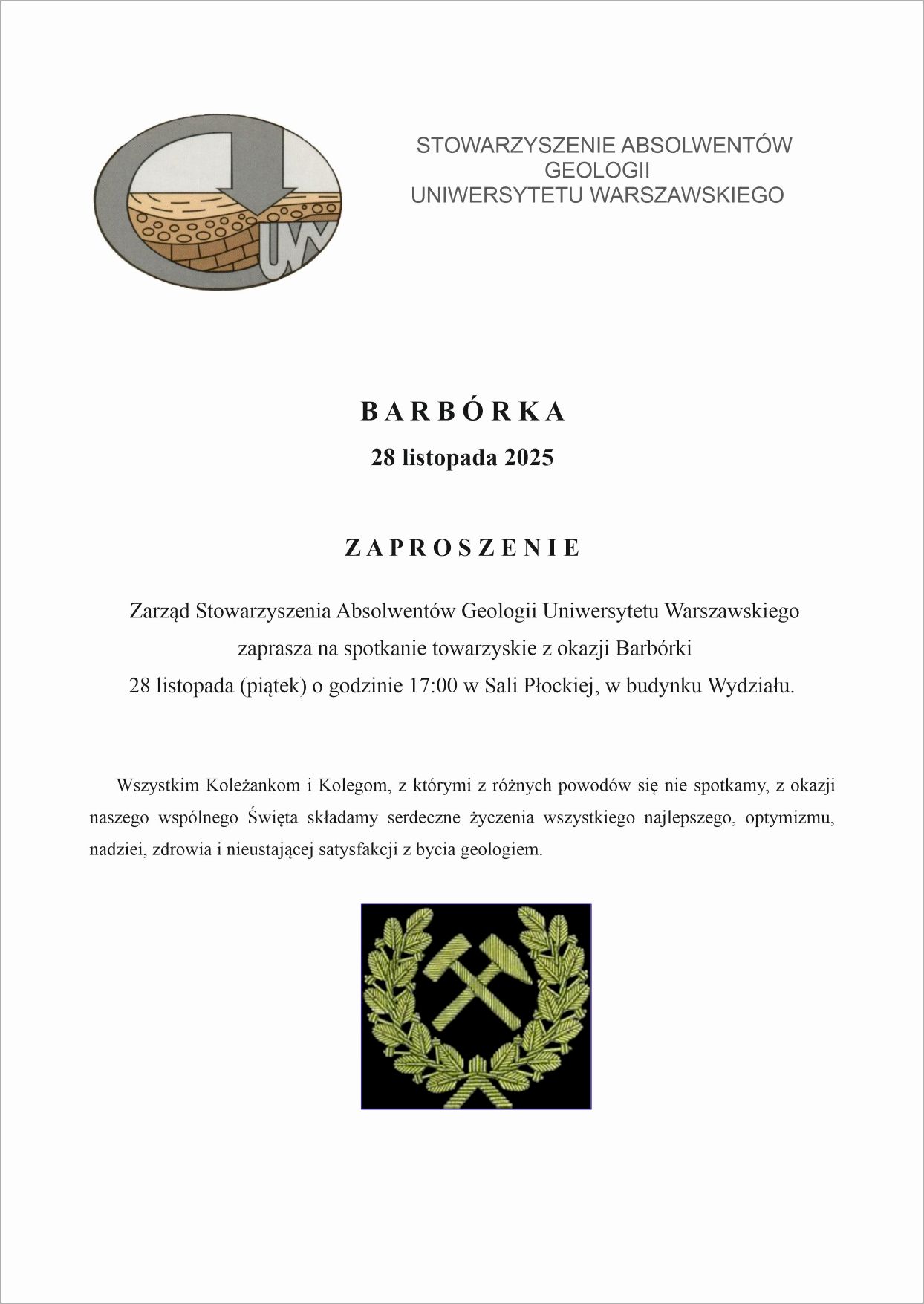 Wszystkim Koleżankom i Kolegom, z którymi z różnych powodów się nie spotkamy, z okazji naszego wspólnego Święta składamy serdeczne życzenia wszystkiego najlepszego, optymizmu, nadziei, zdrowia i nieustającej satysfakcji z bycia geologiem.