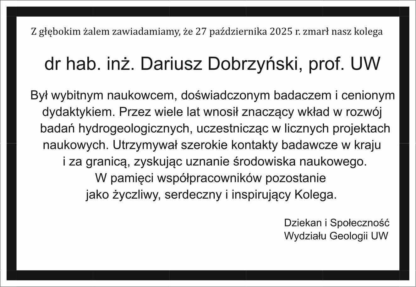 Wydział Geologii > Aktualności > Zmarł dr hab. inż. Dariusz Dobrzyński, prof. UW Zmarł dr hab. inż. Dariusz Dobrzyński, prof. UW nekrolog – dr hab. inż. Dariusz Dobrzyński, prof. UW