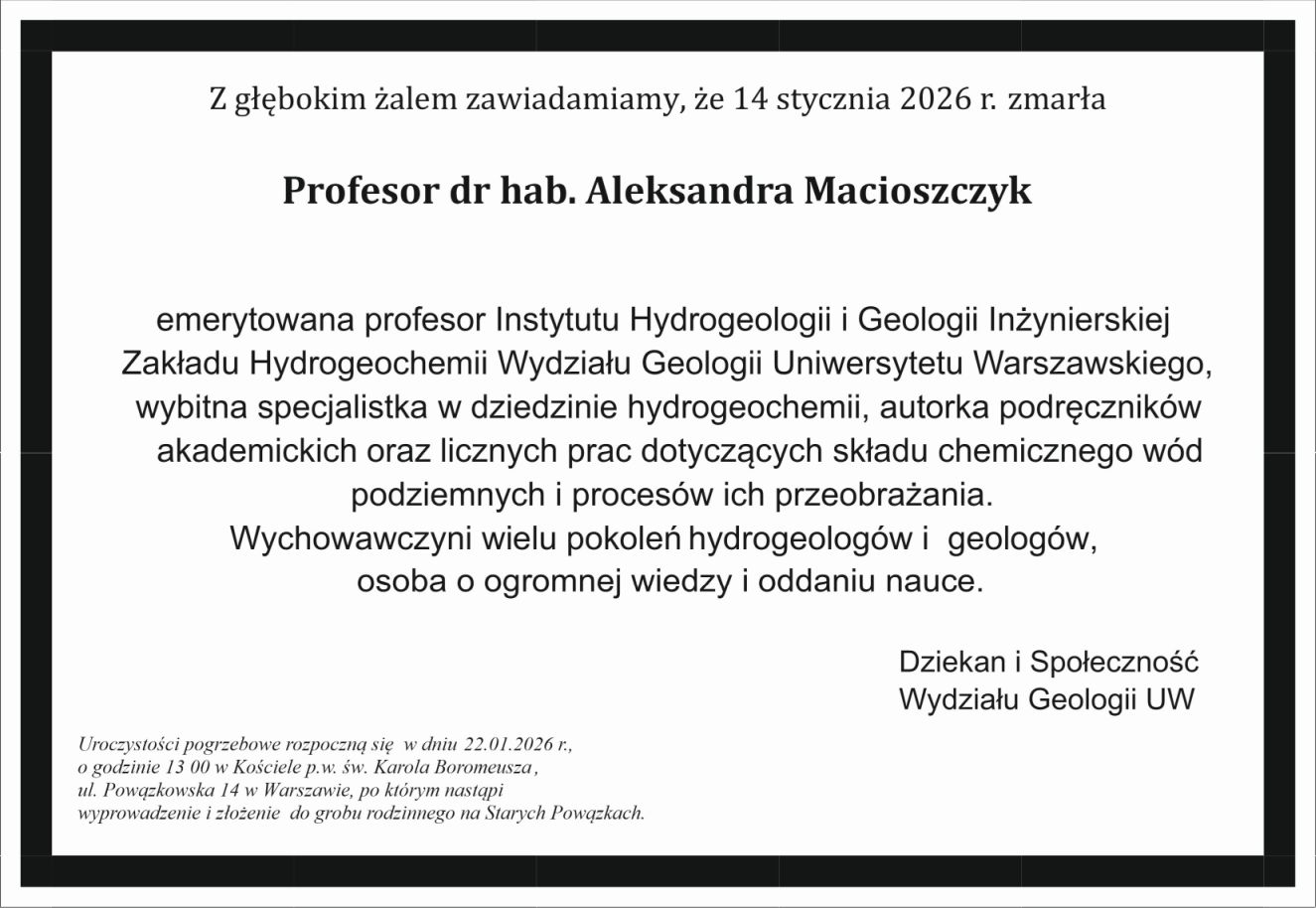 Wydział Geologii > Aktualności > Zmarła prof. dr hab. Aleksandra Macioszczyk Zmarła prof. dr hab. Aleksandra Macioszczyk nekrolog – prof. dr hab. Aleksandra Macioszczyk
